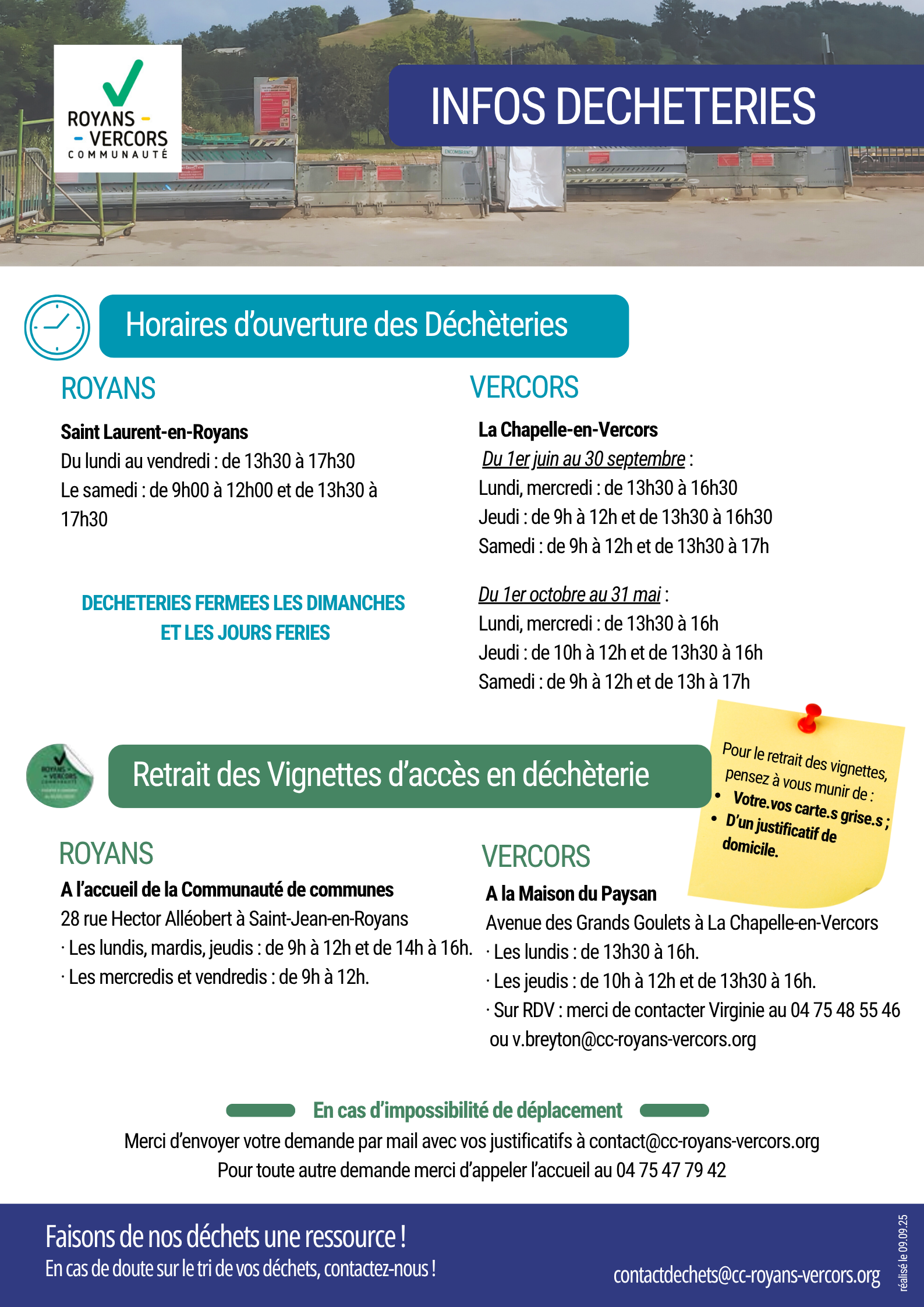 Les vignettes de 2019 pour l’accès aux déchèteries sont toujours valables. Il n’y a pas de nouvelles vignettes. L’affiche qu’on avait diffusée (en PJ) était juste une information pour les nouveaux habitants ou ceux n’ayant pas de vignette.